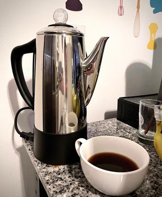 [This review was collected as part of a promotion.] First this was a free product from influencer for review. What a nice shiny coffee pot. I've not seen a percolating coffee pot since I was a kid camping with my mom and dad when I was a young. It's there percolating coffee pot was nothing like this one. Say goodbye to filters this is a high quality easy to clean coffee pot. And The taste is nothing like you could get from a drip coffee pot. I think it's Way Bolder. I love to keep warm setting but I think after like 30 minutes you have to push the power again. And when you take it off the base and put it back on you have to push the power button back on. Cold touch handle and knob. Makes six cups! I ended up giving this as a gift to my aunt's roommate who is awaiting hip surgery but they can't get her blood sugar down to perform the surgery. But her and Aunt enjoy coffee they're in their 60s. And I thought this would be more convenient since she's wheelchair ridden to just have this warm coffee in her room. She doesn't have to get in a wheelchair for another cup. So it's also good for that.