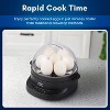 - 7 EGG CAPACITY: Pour 140ml of water onto the heating plate using the included measuring cup. Load pierced eggs onto the tray, place the lid, and press the power button. Then press again to select your preferred doneness. Voice alerts guide you and auto shut function gets it right every time and is faster than conventional stovetop methods!