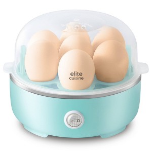 Elite Cuisine Easy Egg Cooker Electric 7-Egg Capacity, Soft, Medium, Hard-Boiled Egg Cooker with Auto Shut-Off, Measuring Cup Included, BPA Free. The convenient automatic shut-off indicator light lets you know exactly when the cooking cycle is complete. The built-in timer adjusts automatically from soft to hard and cooks eggs exactly to your liking! Designed to make busy mornings easier and to save you time & money. Retro Mint color.