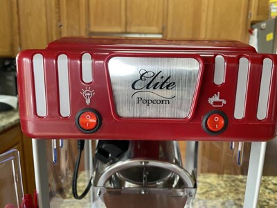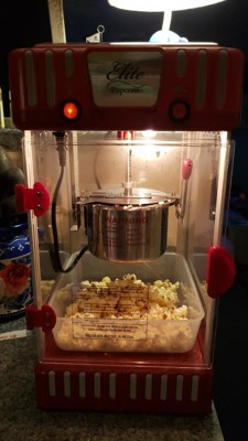 Be a 'pop' star with the Classic 2.5 oz. Kettle Popcorn Maker by Elite. The 2.5 oz. stainless steel kettle makes up to 1 gallon of popcorn per batch in just 5 minutes to share with friends and family. It comes with a warming light to keep your popcorn hot and fresh and a convenient removable tray for serving popcorn on home movie nights. It features plexi-glass doors and windows and an attractive candy apple red finish with silver inlays that will have your party guests in awe. Traditional hot oil kettle popcorn popper.