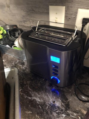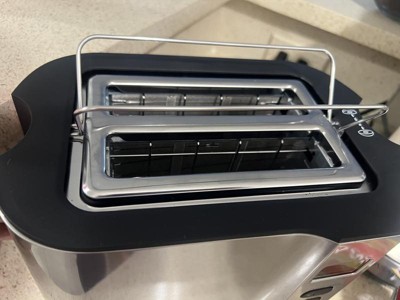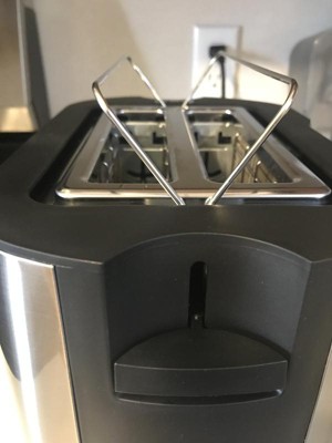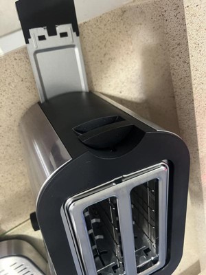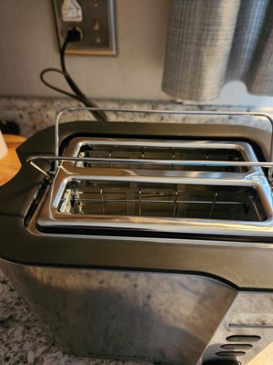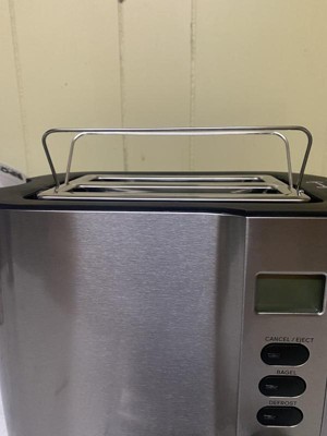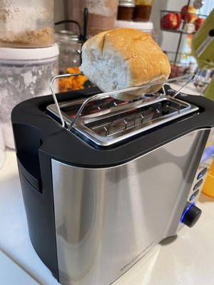 [This review was collected as part of a promotion.] This is a nice 2 slice toaster. It has a digital window to let you know how much time is left on your current toasting. The slots are wide to accommodate extra wide bread and bagels without stuffing them in. There is a retractable warming rack to heat items on top as well. This rack probably would work well with danish, etc. The stainless steel finish is brushed so fingerprints aren't so easily transferred. The pop up of your food is quiet, and it does not launch out of the tray.
