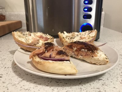 [This review was collected as part of a promotion.] This toaster is great!! The defrost button works great for frozen bread to thaw and then toast it. I like the timer function, since it gives you an exact time the toast or bagel will be done- it allows you to time it out better while I’m also making eggs. My favorite feature is the bread warmer arms. You press the button down on the left side, the metal arms pop up, and you lay whatever you want to warm up on top, and it works great!