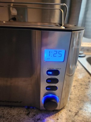 [This review was collected as part of a promotion.] This toaster works great. It is especially good for toasting bagels as it will toast only one side of them. It has an additional bagel setting and a defrost setting. It has a lit digital count down time. There is an eject/ cancel button in case you would want to stop toasting early. There is a warming track above the toast slots. Very nice toaster.