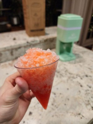 [This review was collected as part of a promotion.] This snow cone maker is a fun kitchen appliance to have on hand for making a midday snow cone treat or frozen margarita. Two things you need to know about me: I love unique kitchen gadgets and cold treats, so when I saw this I knew I had to have it! This is a tabletop snow cone maker. It's relatively large (12.5"x5.5"x5"), but still compact and light enough to be brought along to an event without hassle. It works quick and effectively for what it does; just load it up with ice cubes and press the button! It comes with a freezer mold that perfectly fills the ice cavity, but I have found no issue just using regular ice cubes. The consistency of the ice it creates is more like crushed ice than snow. This makes it perfect for a snow cone, but may be slightly too crunchy for a traditional shave ice (for that reason, I've deducted a star based off of the advertised capabilities). That said, this is so much better texture than the crushed ice mode from your fridge. See my pictures for an up-close comparison of each and you'll see what I mean. The ice consistency from this snow cone makers holds syrup well while also being thick enough to not melt immediately. The device has a few removable parts to fit cones or cups and helps make for easy cleanup. Assembling it was a breeze - we were up and making snow cones within a few minutes after opening. All you need to have a fun time is some ice and the syrups of your choice. All in all, I'd recommend this snow cone maker to anyone looking for a fun summer activity with their kids or for those looking to elevate their frozen drink game. It's just plain fun!
