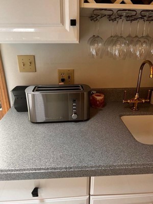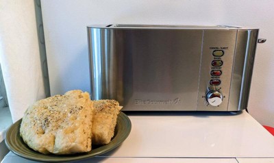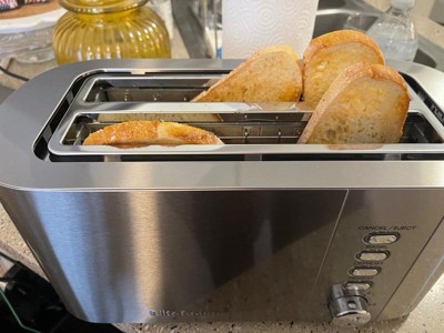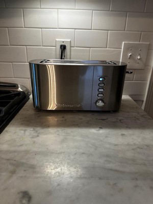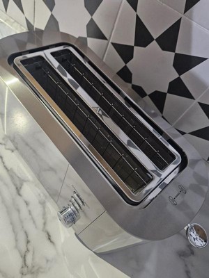 [This review was collected as part of a promotion.] Sleek 4 slice toaster. Looks great on the counter. My husband loves that it can fit his full slice of Turano bread. Shade settings work nicely and typically only have to put it down once for desired toastiness.