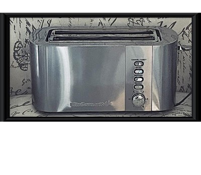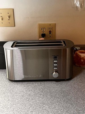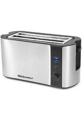 ntroducing the Elite Cuisine Long Slot Stainless Steel Toaster, featuring a sleek and elegant design. Ideal for large families, it has a 4-slice capacity and uniquely designed slots to accommodate extra-wide, long, and tall specialty breads and bagels. The easy-to-use control panel and toasting level dial make selecting your preferred function and toast shade simple, with 6 variable browning shades to choose from. Features include a True Bagel function to toast the inside of bagels while keeping the outside warm and soft, a Defrost function to thaw and toast frozen bread quickly, and a Reheat function to warm previously toasted bread without overcooking. The toaster automatically counts down to ensure perfect toast every time. Keep your countertop tidy with the easy-to-clean slide-out crumb tray and store the cord neatly with the convenient cord wrap. Enjoy the convenience of toasting and warming your favorite foods for breakfast, lunch, or a quick snack.
