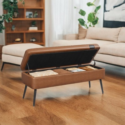ELJGET 43" Folding Storage Ottoman Bench, 660 lb Load-Capacity Footrest Stool with Hidden Storage, Synthetic Leather Seat for Living Room, Brown