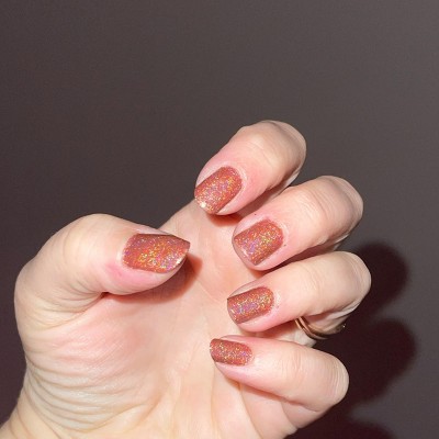 This was the most disappointing nail polish purchase. The nail polish is nothing like the picture which shows a beautiful holographic, warm hue. The polish I received was more of a flat, gross brown color. In direct sunlight it shimmers a bit, but still doesn’t look like the product photo.