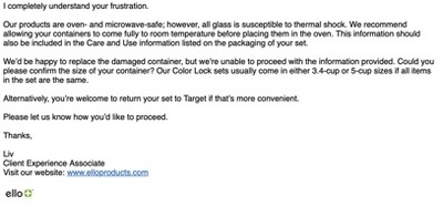 Hello from Ello! We’re sorry to hear one of your Color Lock containers cracked and that your experience with heating guidance felt unclear. While our glass containers are microwave-safe, sudden temperature changes can sometimes cause stress to the glass. We appreciate you sharing this feedback, and we’ll make sure it’s passed along to our team for further review. If you’d like us to take a closer look at your damaged container or see what options might be available, please reach out to us at support@elloproducts.com .
