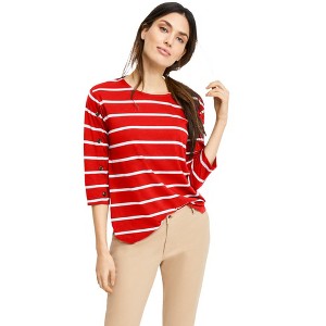 Three-quarter sleeves with decorative side buttons give this tee a nautical note. Tuck it in for a classic look; wear it out to show its curved shirttail hem.