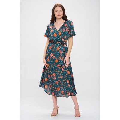 • A: The dress features a stylish surplice neckline that adds elegance.
