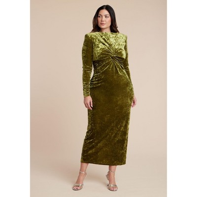 95% Polyester 5% Spandex Close fit bodice with loose skirt Fully lined Back zipper Boning Maxi length 62" from highest point of shoulder on size 18 Velvet, non-stretch woven Turn garment inside out. Hand wash cold with like colors. Only non-chlorine bleach when needed. Lay flat to dry. Cool iron as needed..