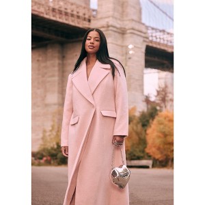 25% Wool 75% Polyester Relaxed fit Fully lined Double breasted button closure with notch lapel Strong shoulder with shoulder pad, Long, two-piece sleeve Hits at the ankle 54" from highest point of shoulder on size 18 Functional flap pockets, welt pockets w/ flaps Center back vent Princess seams Non-stretch woven Dry clean..