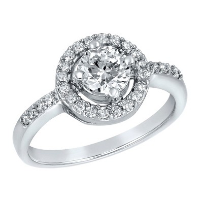 • Ring features a large pear-cut cubic zirconia center stone surrounded by a halo of round-cut cubic zirconia stones