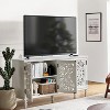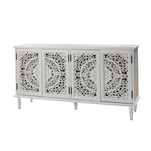 This elegant storage buffet/sideboard is a perfect combination of functionality and style. Crafted from solid hardwood, it features a stunning hollow floral-carved traditional design. There is built-in lighting in this sideboard and buffet, with its recharging LED infrared induction lamp. It helps you find things quicker. With ample storage space, including adjustable shelves and a wine rack capable of holding nine wine glasses, this sideboard effortlessly blends tropical, boho, farmhouse, glam, rustic, lodge, coastal, and French country aesthetics. We offer a range of functional furniture options like sideboards, credenzas, buffet sideboards, hall chests, and cabinets TV stand to use up to TV size 65 inches.