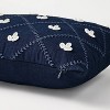 Add coastal vibes to your space with this Embellished Shell Navy Lumbar Pillow from Threshold™ designed with Studio McGee. Designed in a rectangular shape, this navy decorative pillow throw features a tonal embroidered diamond pattern and is embellished with white shell clover motifs in the boxes for a standout look. Crafted with a 100% cotton exterior and filled with 100% polyester fiber, it provides ample comfort wherever you place it.