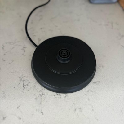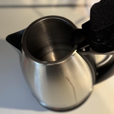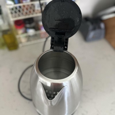 [This review was collected as part of a promotion.] This stainless electric teakettle with base is really nice! It has a red light that lets you know when the water is ready. The handle stays cool so it’s easy to pour from. The off/on button is also on the top of the handle so it’s very convenient to reach. It will automatically turn off also. The water goes through several little holes so it doesn’t come rushing out suddenly. It holds almost 2 liters so plenty for several cups of tea. I received an incentive to write this review.