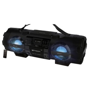 The Emerson EPB-3001 Dual-Subwoofer Bluetooth Boom Box with CD Player and Remote provides powerful, wall-to-wall sound. This high-tech, classic boombox features Bluetooth technology and delivers bass you can feel. Its sleek design with a sturdy, top carrying strap and disco lights adds convenient style to almost any audio setup. The boombox also serves as a portable audio media station with its AM/FM PLL stereo radio with analog tuning, CD/CD-R/CD-RW player, and USB input for MP3 music playback. It can also function as a PA system with its dual microphone and guitar 1/4-in. inputs! The included remote has its own storage compartment so it won't get lost when you're on the move._