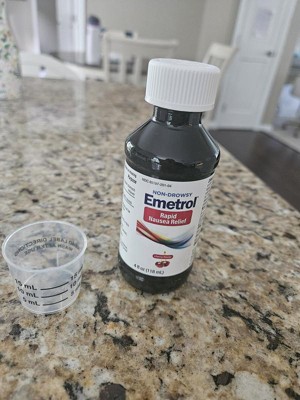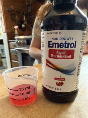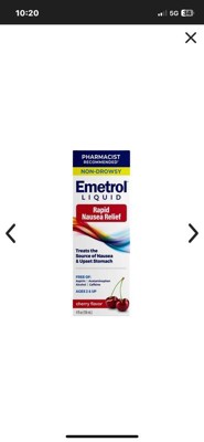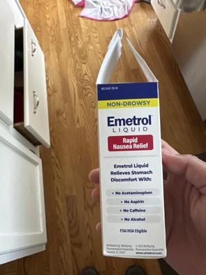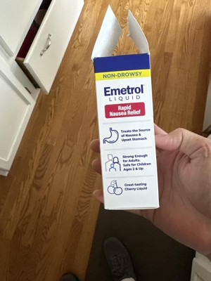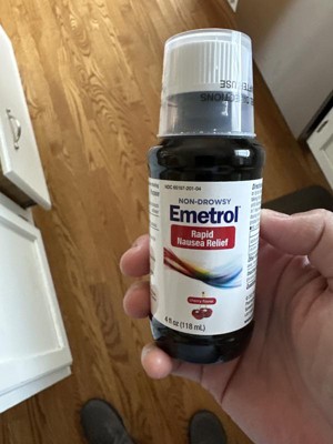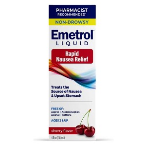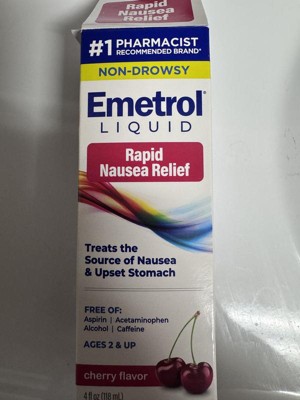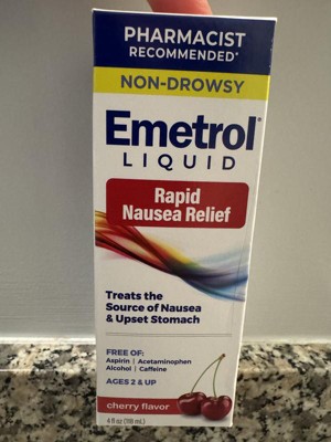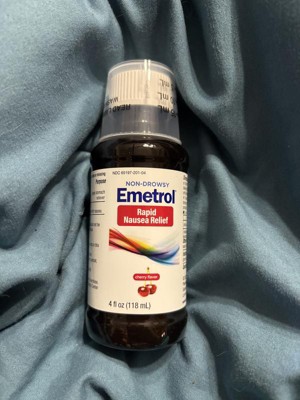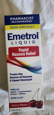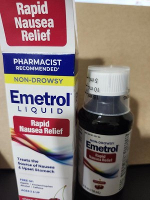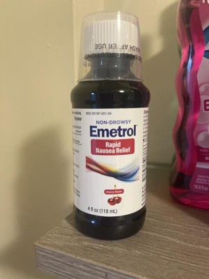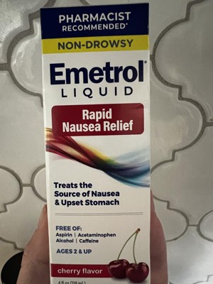 - RAPID NAUSEA RELIEF - Get fast relief from your stomach aches and nausea with Emetrol Liquid. This non-drowsy cherry flavored liquid provides quick relief to your upset stomach. Used to treat nausea that is caused by food poisoning, overindulgence in food and drink, motion sickness, or car sickness
