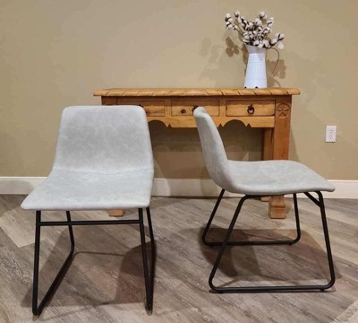 [This review was collected as part of a promotion.] This grey leather set of belnick chairs are a perfect fit, not only appealing to the eye, but comfort takes the cake. The chairs were easy to assemble, and I chose the grey with gold legs. My table and other chairs are straighback wooden chairs, so I replaced the 2 head chairs with these new belnick, and it gives my dinette set a more modern vibe. The leather fabric is very soft to sit on, and the curvature of the back makes it so comfortable to set at for long periods of time, especially when putting together puzzles. I like how easy they clean up from spills or food particles. These chairs would also be a great piece to put in our bedroom with a small table for a conversation area. That is what I like about these chairs, they kind of fit in multiple situations, and one can use them how they choose. Great chairs!!!