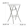 When you need a little extra surface area this folding bar height table is the perfect choice. This plastic folding table is a convenient option when you need to set up tables for special events, cook-outs on your patio at home or when you're serving snacks around the pool. Use during events as a mixing bar and pair with table height tables for a touch of elegance. This durable, easy to clean table is commercial rated for use in banquet halls, convention centers and at trade shows. The thick, granite white tabletop is 1.75" thick, and will comfortably seat up to 3 adults. Its waterproof, impact and stain resistant top have a 165 pound static load capacity. Non-Locking bar height gray powder coated cross legs fold to transport and store. Non-marring floor caps protect your floor by sliding smoothly when you need to move it. The 32" Round Granite White Plastic Bar Height Folding Table is a convenient option for your next home, school or business event. Designed for both indoor and outdoor use, store table indoors and protect the frame from extreme moisture. Additional Features: Non-Locking Bar Height Gray Powder Coated Cross Legs with protective floor caps, Multipurpose plastic table: patio table, event table, drink and food table
