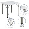 It's game time when you pull this folding table out that folds in half and includes a carrying handle to take with you anywhere. This square plastic folding table is perfect size seating up to 4 people for charades, card and board games, making slime, or painting clay pots. This compact table can serve multiple uses in the hospitality industry, business offices and in the home to seat extra people or hold plates, napkins and cups during gatherings. Dine outdoors on the deck to enjoy the summer breeze, this table sets up in no time. This mini table travels well for people who live on the road in vans, campers and RVs. When you're ready to put away the legs lock underneath the top to be stored away. Enjoy this portable table inside or outside but always store indoors to protect the frame from extreme moisture.