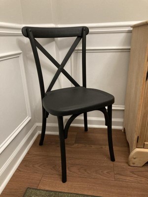 Each black resin x-back chair features a solid resin construction with one piece frame sections and a steel core throughout the lower half to improve stability. These resin cross back chairs ship fully assembled and are stackable up to 8 high for easy storage and portability. Sometimes referred to as farm chairs, each black resin x back chair makes an ideal complement to elegant banquet halls, wedding event facilities and dining venues. Additional Features: Perfect for banquet halls, wedding event facilities and dining venues, 2 year normal use warranty