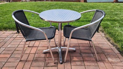 Create an enjoyable dining experience with this table set that will enhance your bistro, cafe, restaurant, hotel or home patio space. The designer style stainless steel table top features a smooth surface for keeping items level. The column and base are constructed of lightweight aluminum material. The chair is lightweight and easy to move and store. For easy storing and cleaning purposes these chairs stack up to 20 chairs high. This set was designed for all-weather use making it a great option for indoor and outdoor settings. For longevity, care should be taken to protect from long periods of wet weather. Whether you are just starting your business or upgrading your furniture this set will complete the look. Additional Features: Integrated Arms, Cross Braces provide extra stability, Aluminum Frame, Plastic Floor Glides, Chair Size: 21.75"W x 22"D x 29"H