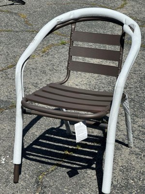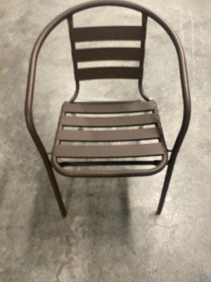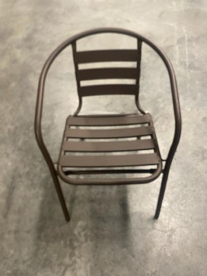 Dine outdoors with this comfortable metal patio set for your deck, restaurant or hospitality business. This set features a round metal table with a smooth surface and 2 curved slat back chairs with textured seats for a comfortable and safe seating experience. The lightweight design of this patio set makes it a breeze to move and the chairs stack for storage while cross braces provide extra stability. The protective plastic feet prevent damage to flooring. The frames are designed for all-weather use making this lounge seating a great option for indoor or outdoor use. For longevity, care should be taken to protect from long periods of wet weather.
