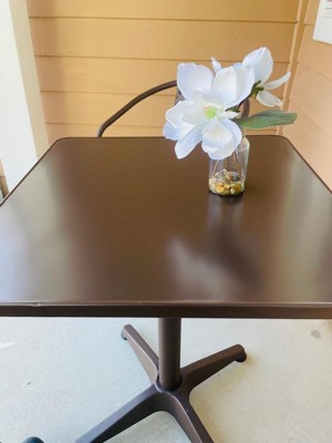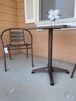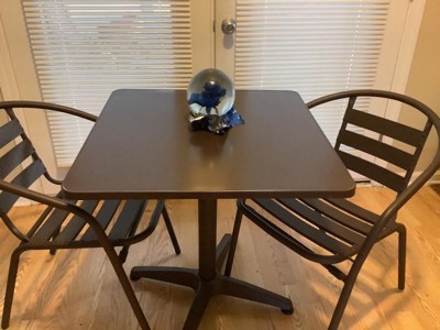 [This review was collected as part of a promotion.] I received the Lila 23.5" Square Aluminum Indoor-Outdoor Table Set with 2 Slat Back Chairs from Influenster to try out and provide my honest review. Overall, I would give this product 3 out of 5 stars. The table and chairs are lightweight and easy to move, making them a great option for indoor and outdoor use. The ensemble was very easy, and was completed without the instructions. I will be leaving this set in my yard until summer patio furniture comes out. The stainless steel table top is smooth and keeps items level, and the column and base are constructed of hard aluminum material. The chairs also stack well for easy storage when needed for the winter. However, I have some reservations about the product's longevity. While the manufacturer claims it's designed for all-weather use, I worry that exposure to long periods of wet weather or sun could damage the set. The coating, which is a cute bronze brown in color, is very easy to scratch. Additionally, the chair is hard on my back. Overall, this set is a good option for those looking for a lightweight, versatile table and chair set but may not be the best choice for heavy-duty use or harsh weather conditions.