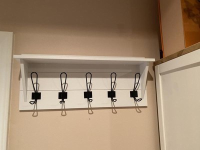 [This review was collected as part of a promotion.] The Daly wall mounted 24 inch shelf with 5 hooks underneath is a perfect addition for my smaller second bathroom. It is solid pine not particle board and painted white with five black metal hooks. It’s great for hanging my robe, towels and clothes. For me it’s a real space saver and I love it.