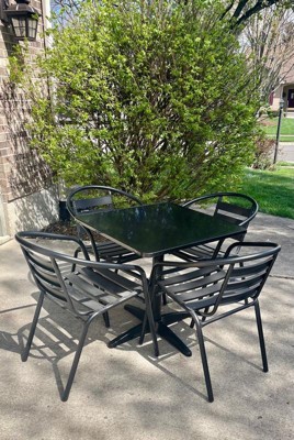 If you love hosting family and friends on your deck or need extra seating for the new dining patio of your cafe, this square table and 4 chair set is just what you need. The table's stainless steel designer top has a smooth surface for keeping items level. The column and base are constructed of lightweight aluminum material. The lightweight chairs feature a curved triple slat back, textured seat and integrated arms. Cross braces provide extra stability when sitting and these sturdy chairs hold up to 352 lb. weight capacity. For easy storing and cleaning purposes these chairs stack up to 4 high. This set was designed for all-weather use making it a great option for indoor and outdoor settings. For longevity, care should be taken to protect from long periods of wet weather. Whether you are just starting your business, expanding your "al fresco" seating or springing for the outdoor kitchen you've always wanted, this set will give you the perfect look.