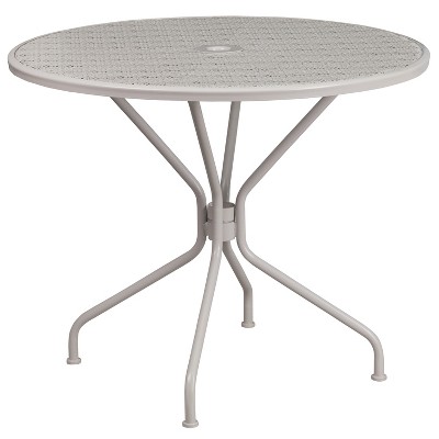 Emma and Oliver 3 Piece Patio Table Set - Synthetic Faux Teak 35" Square Dining Table with Umbrella Hole & Gray Umbrella with Weighted Base