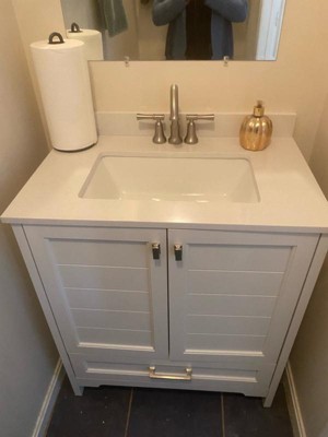 [This review was collected as part of a promotion.] I am so beyond thankful to have received this beautiful, high quality vanity in exchange for an honest review. We really needed a new vanity in our main half bathroom. This was the perfect size. It is light and beautiful and the quality is exquisite. It took about 1 hour to assemble. There were not instructions included, but we found some online. We hit a few road blocks during installation, but nothing a few trips to Home Depot couldn’t solve. Overall everything worked out and it looks great.
