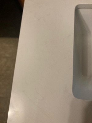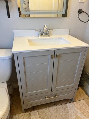 [This review was collected as part of a promotion.] I have had this vanity installed for a little while now and it's been a wonderful upgrade from a sink that was broken after the ceiling vent fell and broke the previous sink. If I had known a little more I would have possibly chosen a different faucet, because the short depth of the sink can sometimes lead to a lot of splashing with the faucet at full power. At first glance, this vanity looks great, but when you look closer, it’s a little cheap. The wood is easily scratched and the thin veneer can be scraped by accident with a fingernail. I wouldn’t expect it to hold up for years if you’ve got kids or a high-traffic bathroom. That said, it's perfect for a rental unit, a budget-friendly bathroom upgrade, or as a DIY project. I will likely need to repaint it in a couple of years based on how much has already come off. Assembly is about as intimidating as building a bookshelf. If you’ve done that before, you’ll have no problem here. It’s more open in the back, which can be convenient for plumbing but feels a bit unfinished. The proportions are slightly off with the sink top higher quality than the cabinet itself, which makes the cabinet’s super-thin veneer stand out more. The drawer is usable but flimsy, and the guides could definitely be smoother. It's basically a bookshelf with a marble sink top and for the look it's nice. An affordable way to upgrade without having to take out a loan just for a nice looking sink.