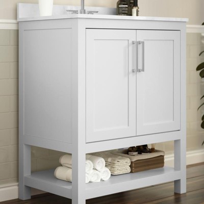 [This review was collected as part of a promotion.] This 30” bathroom vanity is a simple design with classic lines. With double doors with self close and quiet close. Nice Carrara marble top with an optional back stop is ready for your own faucet set. Came fully assembled with leveling legs makes for an easy installation. Very happy with quality and the classic look .