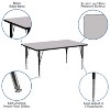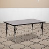 Give the little ones a creative space designed just for them with this adjustable height rectangle activity table that is a must have for daycare, preschool and early childhood development centers. Enhance collaborative learning by grouping tables together. It will accommodate children up to age 7. It features a 30"W x 72"L thermal fused scratch, stain and warp resistant gray laminate top with a black edge band and 16 gauge tubular steel legs for increased stability. The top incorporates a protective underside backing sheet to prevent moisture absorption and warping. An attractive black powder coated finish protects the upper legs from scratches and height adjustable chrome lower legs give you the flexibility to raise or lower the table a full 9" in 1" increments. Self-leveling nylon floor glides keep the table from wobbling and protect your floor by sliding smoothly when you need to move it. Perfect for craft time, snack time and party time, this easy to clean table is just the right size for small children. Additional Features: Legs Adjust in 1" Increments, Self-Leveling Nylon Floor Glides, Recommended Grade Level: Preschool - 2nd Grade, Recommended Seating Capacity: 10 Children, 2 Year Limited Warranty..