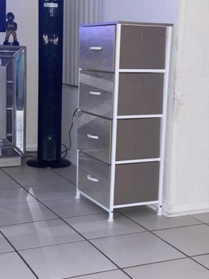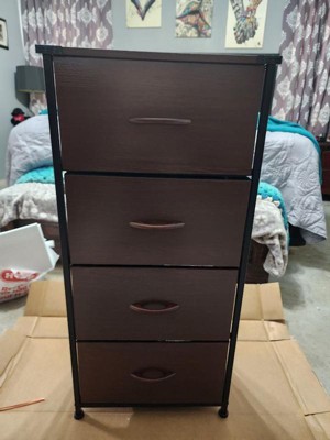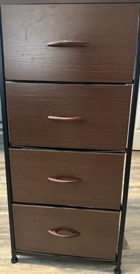 Get much needed storage at an economical price with the smart design of this 4 drawer vertical organizer. Whether you need a place for laundry supplies, washcloths, or charging cords and remote controls, the four easy engineered wood drawers with wooden handles are a perfect solution. Use this vertical storage tower as a nightstand to hold your cell phone, glasses, or nighttime glass of water. Storage doesn't have to be bulky to be strong. The engineered wood top and powder coated cast iron frame of this dresser provide a stable, hard surface to set books, lamps, or a vase of fresh flowers and holds up to 40 lbs. static weight. Non-Woven fabric drawers not only look great but are fade and stain resistant to help this dresser with drawers retain its great looks. Quick and easy assembly can be achieved in 10 minutes or less with the step-by-step illustrated instructions or online PDF. Plastic adjustable floor glides protect your hard flooring surfaces and provide a stable platform on uneven flooring surfaces. Quickly remove spills with a clean dry cloth. Use this 4 drawer dresser in or out of your closet for extra organization that goes above and beyond plain plastic bins.