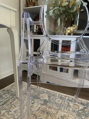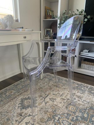 If you love to move your furniture around with the change of seasons, or just the change in your mood, then this ghost chair with arms is a great choice. The transparent ghost chair brings fluid design, elegance and function to your home, restaurant and special events. This modern chair with its Louis XVI styling and near invisibility won't get in the way of your artwork and other furniture pieces, lightens a crowded space and can make a small room appear larger. Curved arms and a contoured seat make this chair comfortable and its polycarbonate molded structure makes it shock, scratch and water resistant. Protective floor glides protect your floor by sliding smoothly when you need to move these beautiful chairs. Designed for indoor-outdoor and commercial use, the understated ghost chair is a classic accent chair that highlights almost any decor without blocking the view.