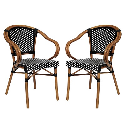 Emma & Oliver Soie Set of Four Indoor/Outdoor Stacking Thonet Bistro Style Chairs with Arms, PE Rattan Seat and Bamboo Finished Metal Frame