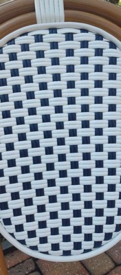 Product Name: Emma & Oliver Colmar Set of Four Indoor/Outdoor Stacking Thonet Bistro Style Chairs with Arms, White & Navy PE Rattan Seat and Nat Bamboo Metal Frame