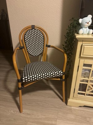 Bring the street vibes of Paris right into your restaurant, bistro, hotel, or backyard patio with this set of four indoor/outdoor commercial grade bistro chairs. The durable PE rattan Thonet-style backs and seats are very comfortable and won't fade when used outdoors. The lightweight, but sturdy, powder coated metal frames boast a bamboo look finish, hold up to 400 lbs. static weight, and will not rust. Recommended stack height for these chairs is up to 5 high for storage or transport. Two curved arms deliver additional comfort and structure. For your convenience, these chairs arrive completely assembled for instant use and feature floor protector glides to prevent damage to indoor hard flooring surfaces. These dining chairs easily wipe clean with a damp cloth for quick seating turnaround.