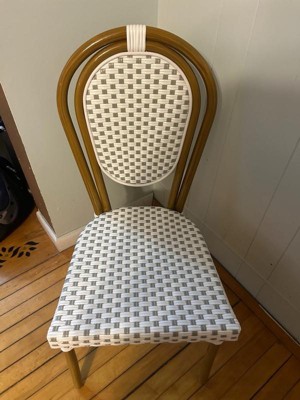 Bring the street vibes of Paris right into your restaurant, bistro, hotel, or backyard patio with this set of four indoor/outdoor commercial grade bistro chairs. The durable PE rattan Thonet-style backs and seats are very comfortable and won't fade when used outdoors. The lightweight, but sturdy, powder coated metal frames boast a bamboo look finish, hold up to 400 lbs. static weight, and will not rust. Recommended stack height for these chairs is up to 5 high for storage or transport. For your convenience, these chairs arrive completely assembled for instant use and feature floor protector glides to prevent damage to indoor hard flooring surfaces. These dining chairs easily wipe clean with a damp cloth for quick seating turnaround.