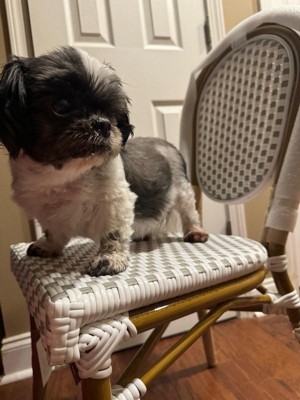 [This review was collected as part of a promotion.] This chair in the French rattan design is both incredibly adorable and sturdy. Since the rattan is composed of plastic, I don't think it will break with time. In addition, owning this chair allows me to appreciate how stylish my house looks and to quickly clean up any food messes and dust my toddler may have made. The plastic nature of the rattan makes it incredibly comfy to sit on and doesn't hurt my silk outfits and pj pants. You may put this kind of chair outside without worrying about rain, humidity, or mold growth. As I previously stated, this kind of chair is fantastic as I can wash or wipe away all the dust while maintaining my fancy boho style. I feel like dining in a French style cafe using this chair! I wish I could get 3 more to complete my dining set.