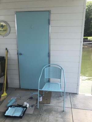 I bought this table and 4 chairs for my dock on a lake. I wanted lots of color and the sky blue was beautiful! The rain pattern was very unique and different from most of the mesh steel sets. I painted the dock shed door to match the table/chairs. The chairs are perfect size and very stable. What a wonderful set for a vacation place