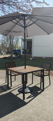 Provide a cool, shady spot for dining or relaxing on the deck or patio with this 5 piece patio set. Synthetic faux teak slats contrast with the black metal frames. The polyester umbrella with weatherproof base will protect your electronics. The 18 gauge steel frame of the patio table holds up to 300 Lbs. static weight capacity while the 12 gauge aluminum patio chairs stack up to 8 high. The 30+ UV treated polyester umbrella boasts push button tilt. Powder coating resists nicks and scratches and is weather-resistant. The chairs arrive ready to use and the table assembles in 30 minutes or less. For the umbrella, simply press down the lock button and attach the pole extension. Dining table and chairs wipe clean with water and a neutral detergent and the umbrella cleans with a water based cleaner. Fixed glides will maintain the appearance of your hard flooring surfaces. Additional Features: Powder Coated Aluminum Frame is rust and weather resistant, 300 Lbs. static weight capacity, Lightweight Design Stacks Up To 8 High for storage or floor maintenance, Patio Umbrella Size: 5.5-104.5"W x 5.5- 104.5"D x 96.5"H | Pole Diameter: 1.5", 30+ UV Treated Polyester Vented Top withstands light breezes and rain, Smooth Crank Motion and 33° Push Button Tilt for custom shading
