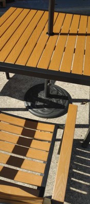 Provide a cool, shady spot for dining or relaxing on the deck or patio with this 5 piece patio set. Synthetic faux teak slats contrast with the black metal frames. The polyester umbrella with weatherproof base will protect your electronics. The 18 gauge steel frame of the patio table holds up to 300 Lbs. static weight capacity while the 12 gauge aluminum patio chairs stack up to 8 high. The 30+ UV treated polyester umbrella boasts push button tilt. Powder coating resists nicks and scratches and is weather-resistant. The chairs arrive ready to use and the table assembles in 30 minutes or less. For the umbrella, simply press down the lock button and attach the pole extension. Dining table and chairs wipe clean with water and a neutral detergent and the umbrella cleans with a water based cleaner. Fixed glides will maintain the appearance of your hard flooring surfaces. Additional Features: Powder Coated Aluminum Frame is rust and weather resistant, 300 Lbs. static weight capacity, Lightweight Design Stacks Up To 8 High for storage or floor maintenance, Patio Umbrella Size: 5.5-104.5"W x 5.5- 104.5"D x 96.5"H | Pole Diameter: 1.5", 30+ UV Treated Polyester Vented Top withstands light breezes and rain, Smooth Crank Motion and 33° Push Button Tilt for custom shading
