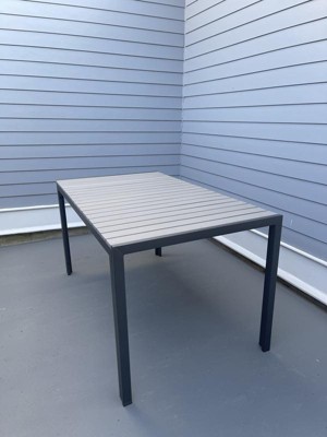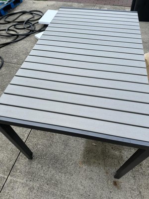 Product Name: Emma and Oliver 55" x 31" Outdoor Dining Table with Gray Faux Teak Poly Slat Top and Gray Metal Frame