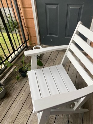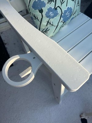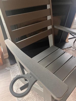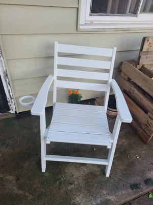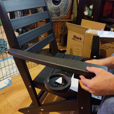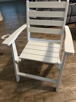 [This review was collected as part of a promotion.] What a great chair! It’s super sturdy, easy to put together, and weather resistant. Oh and it’s not bad for comfort either. Both my husband and I thought it was wood but found it’s a plastic product. It’s VERY heavy so I would have never known. The cup holder is perfect for your tumbler or what have you. It’s also dinner table height so you can use it for extra seating around the dining room or patio table when extra guests pop by.