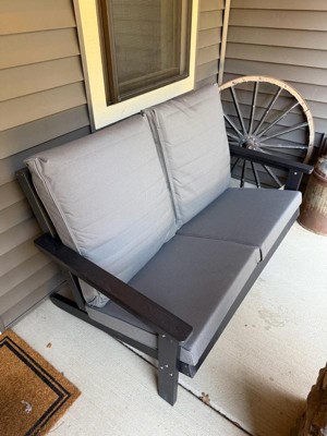 [This review was collected as part of a promotion.] Great outdoor furniture. This bench is a wonderful addition to my deck. It is very sturdy, and I have no fear when seating two people that it will hold just fine. It does not wobble at all, and feels like it will generally last a long time. Good build quality. The assembly was very simple, as there are only really only 6 pieces you have to put together. The cushions are great too, as they are not attached so you can remove them in the winter. Water beads up nicely on the cushions as well, so even if it just rained you can wipe them off and they wont be soaking wet.